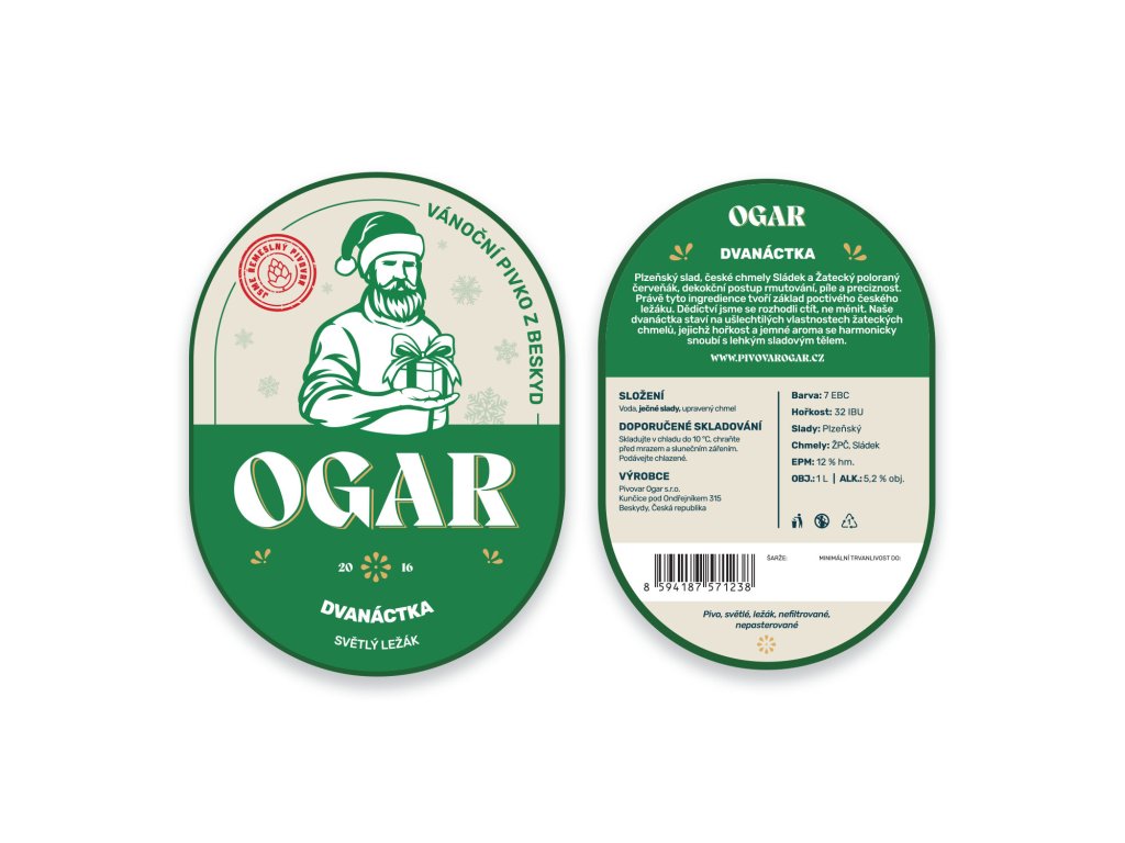 Ogarova dvanáctka je tradiční český světlý ležák plzeňského typu, který vyniká plnou hořkou chutí ušlechtilého chmele pečlivě vybraného našimi sládky. Právě Žatecký poloraný červeňák ve spojení s plzeňským sladem dává pivu nezaměnitelnou vůni. Beskydská voda pak umocňuje jeho osvěžující charakter.
